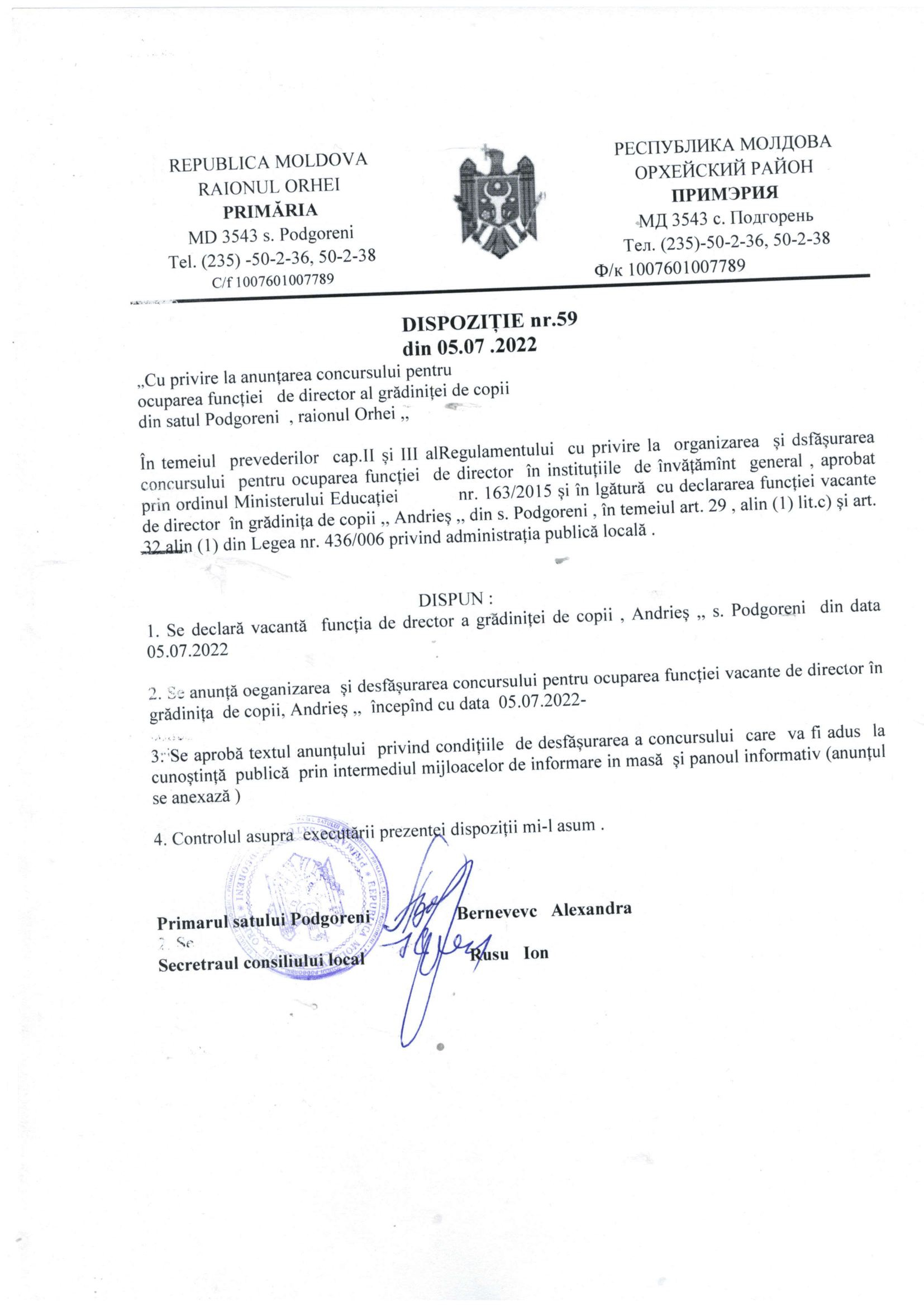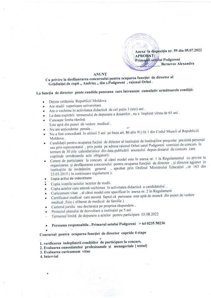 Anunț cu privire la funcția vacantă de director la grădinița din satul Podgoreni
